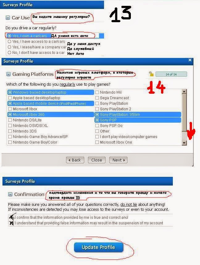 Можете слегка подвирать, к примеру, если у Вас нет домашнего животного или водительского удостоверения, пишите, что есть! Проверять никто не будет, и когда будут рассылать очередной опрос автолюбителям или владельцам собак, Вы попадёте в список потенциальных респондентов. Так же Если вы не пьете Виски или Кофе и другие продукты все равно указывайте, что вы их употребляете.